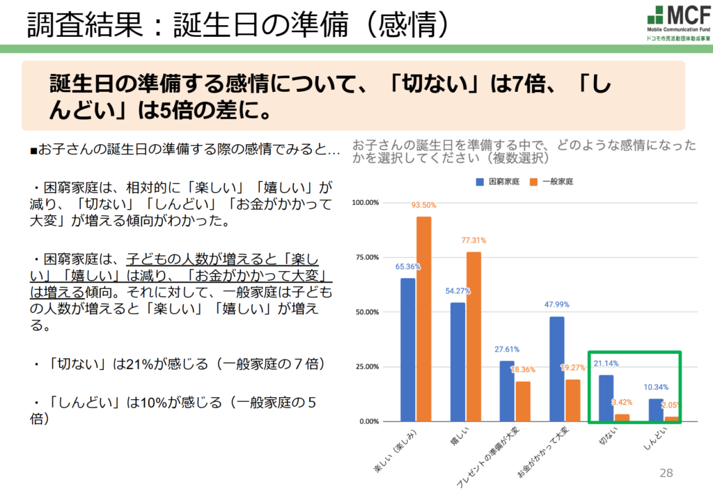 また、誕生日を準備する感情についての設問では、困窮家庭は、相対的に「楽しい」「嬉しい」が減り、「切ない」「しんどい」「お金がかかって大変」が増える傾向がわかった。具体的には、困窮家庭の2割が「せつない」、1割が「しんどい」と感じていると判明。一般家庭の割合と比べると、「切ない」は7倍、「しんどい」は5倍の差となりました。