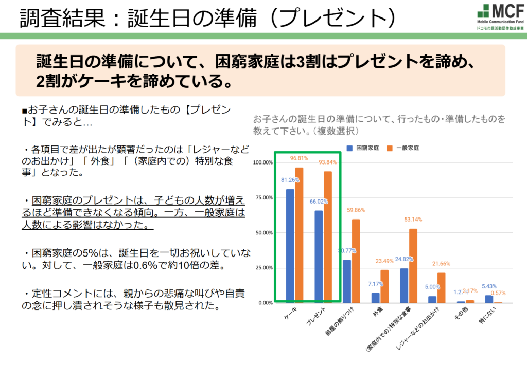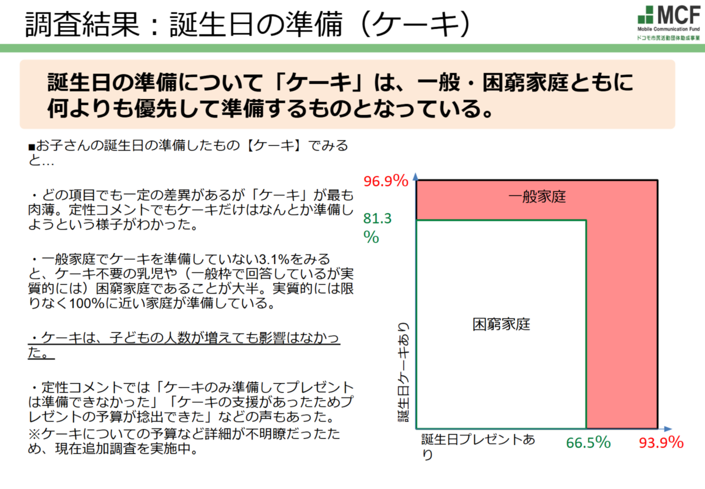 一般家庭は(ケーキを食べない乳児などを除くと)実質100%が子どもの誕生日ケーキを準備していたのに対して、困窮家庭の2割がケーキ自体を諦めていることが判明。また、誕生日ケーキを準備できた8割の中にも「子ども3人にケーキはひとり分だけだった」「食料寄付で頂いたホットケーキミックスでケーキを作った」「(手作りした)誕生日ケーキにフルーツをのせてあげたかった」「食パンにヨーグルトを塗ってサツマイモを飾ったケーキを用意したが、兄弟の分のケーキが無くて、1番上の子が静かに泣いていた」といった声もあり、満足に準備できていない家庭が多く含まれていることがわかりました。